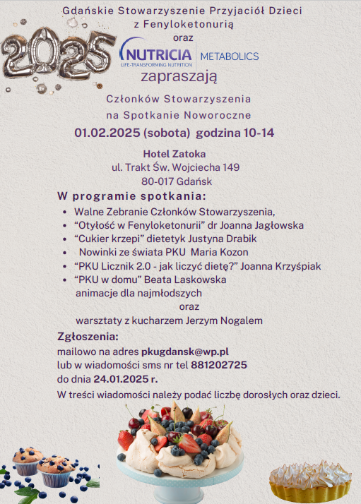 W imieniu Zarządu Gdańskiego Stowarzyszenia Przyjaciół Dzieci z Fenyloketonurią oraz firmy Nutricia serdecznie zapraszamy na spotkanie Noworoczne, które odbędzie się 01 lutego 2025 r. (sobota) w Gdańsku w Hotelu Zatoka przy ul. Trakt Św. Wojciecha 149, w godzinach 10.00-14.00.